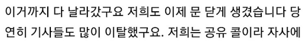원래 언론에 제보 하려고 오픈채팅방 찾아보고 연락 해봤는데 어차피 욕만 먹을 거고 사실 위반 신고 때문에 그런거 올리는것도 웃기고 해서 그냥 관뒀습니다