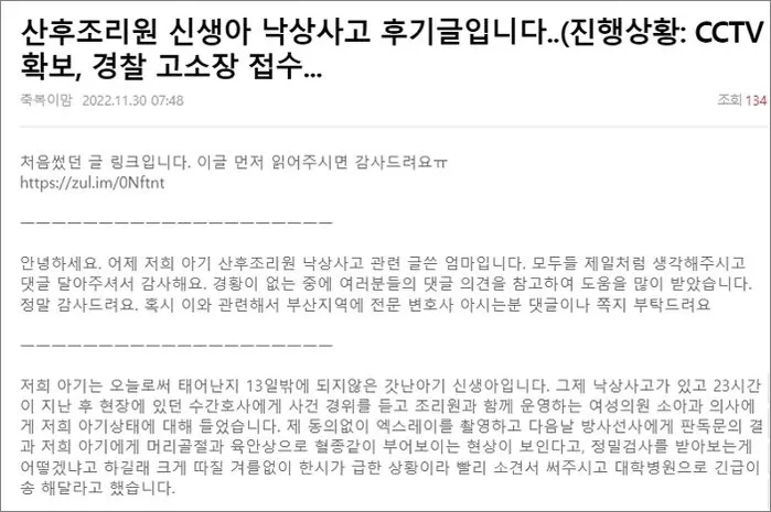 B씨는 CCTV를 확인해본 결과, 조리원 측의 당초 설명과 실제 사고 상황은 차이가 있다고 했으며, 조리원 측 수간호사는 “처치대에서 직원이 아이를 1분 정도 방치했고 그사이에 아기가 움직이면서 떨어졌다”고 전했다.