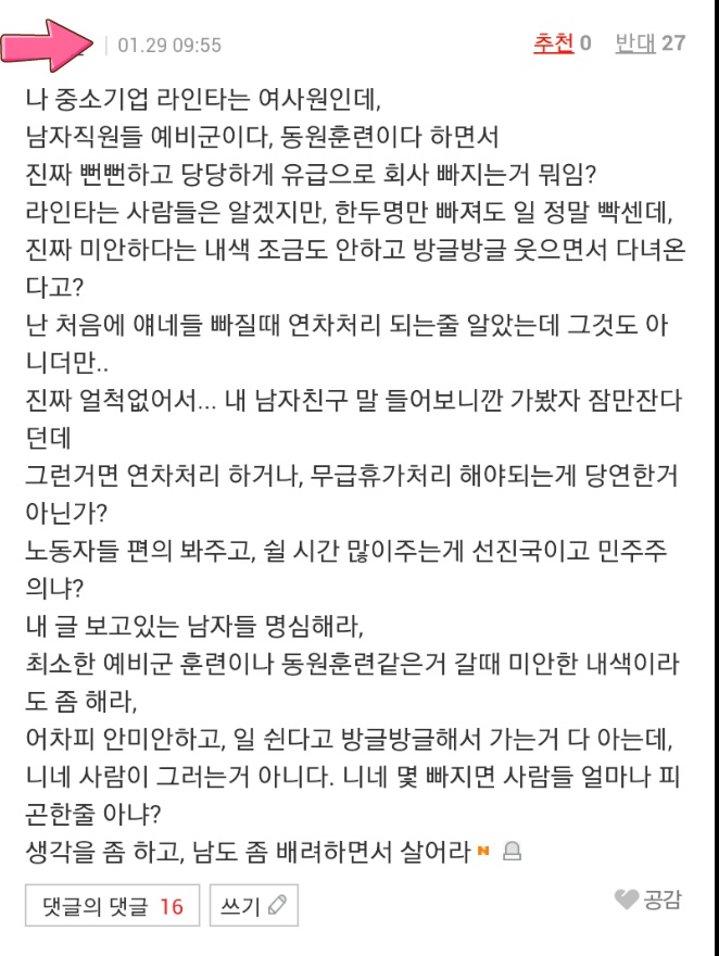 하지만 일각에서는 “이렇게 님들의 인식이 이러니까 한국의 기업 문화가 바뀌지 않는 것이다. 남자랑 여자는 당연히 다른 것인데 니들이 생리를 하냐 임신을 하냐 뭘 하냐 ㅋㅋ 하나도 하는 것 없으면서 여성이라는 이유로 갈구지마라. 세계에서 한남만 이런다” 라며 한국 남성 비하적인 단어를 쓰면서 반박했다.