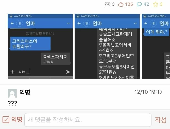 크리스마스를 앞둔 여성이 친구와 통화한 후에 크리스마스 때 무엇을 할 것이냐고 바로 도착한 문자가 친구가 보낸줄 알았다며 친구에게 답장하듯 ‘♡섹X파티♡’라고 보내는 대참사가 일어났다.