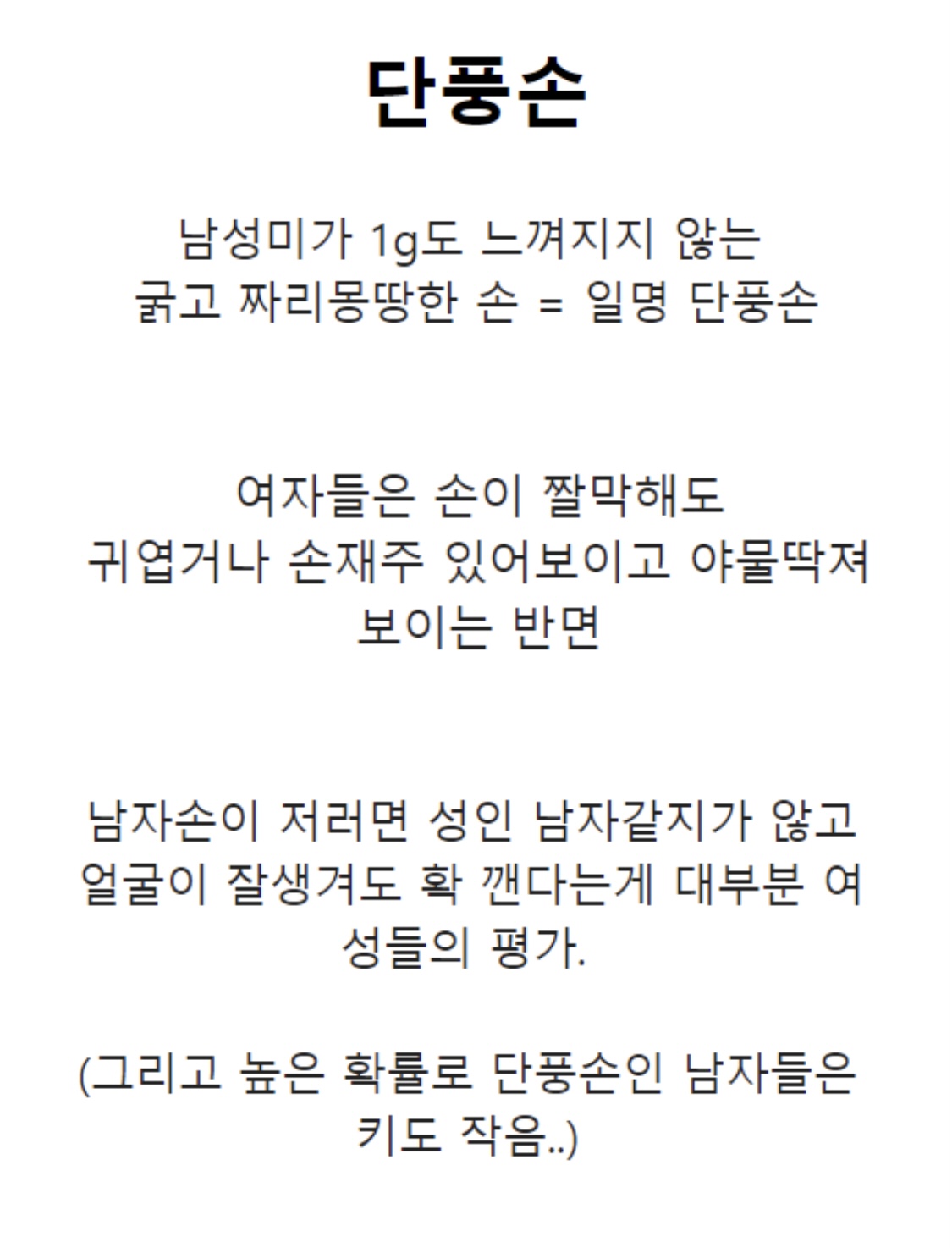 여자들은 손이 짤막해도 귀엽거나 손재주 있어보이고 야물딱쳐 보이는 반면 남자손이 단풍손이면 성인 남자 같지가않고 얼굴이 잘생겨도 확 깬다는 주장이다.