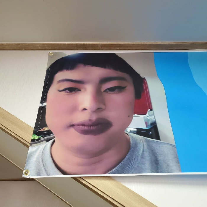 맛있게 드시고 힘내세요”라는 문구와 사진을 넣은 플랜카드가 담겨져 있다. 사진 속 기안은 아이라인과 어두운색 립스틱으로 분장한 모습이다.