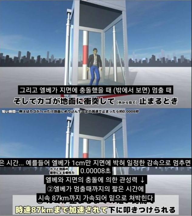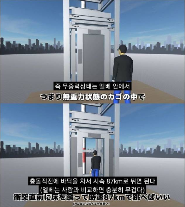 무중력 상태에서 엘베 안에서 충돌직전 바닥을 차서 시속 87km로 뛰면 된다.