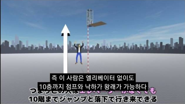 하지만 엘리베이터가 지면에 떨어질 때 같이 점프를 해서 그 힘을 상쇄시킨다면 충격도 상쇄된다.