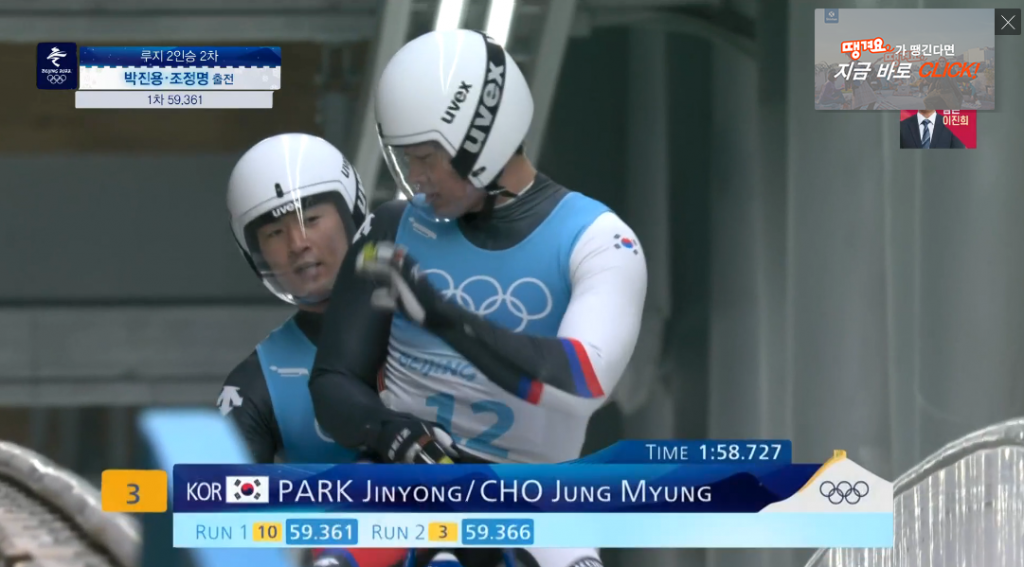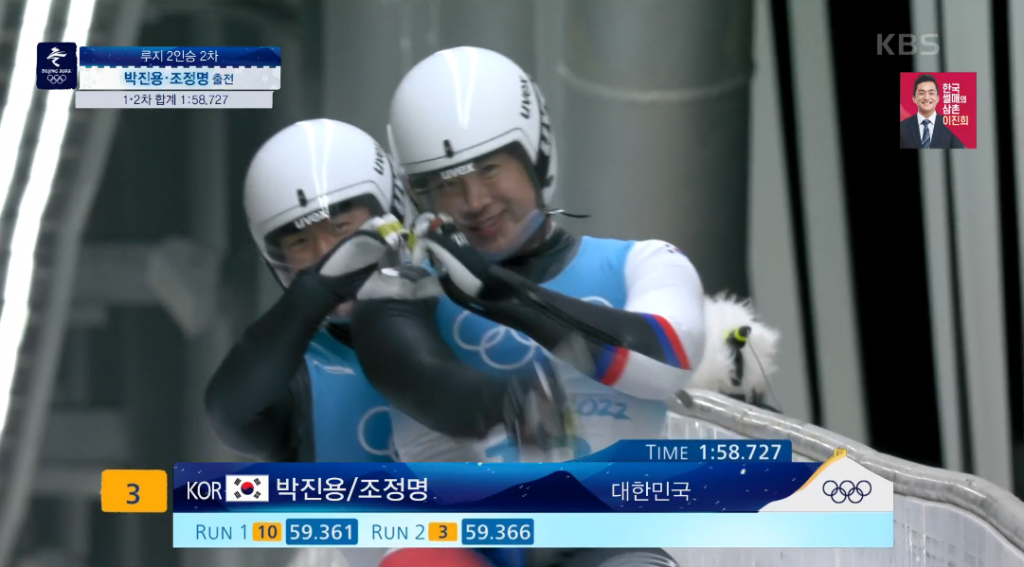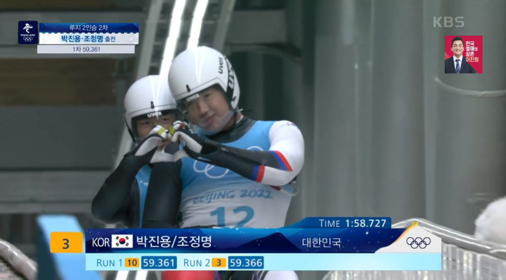 지난 9일 2022 베이징 동계올림픽 루지 더블 경기에서 우리나라의 박진용(경기도청), 조정명(강원도청)이 출전, 1분 58초 727을 기록하며 17개 조 가운데 12위에 올랐다.