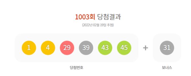 동행복권에 따르면, 이날 추첨한 제 1003회 로또 복권 추첨에서 1등 당첨번호는 ‘1,4,29,39,43,45’로 결정됐다. 2등 보너스 번호는 ’31’이다.