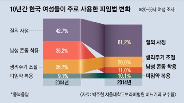 그래프에 따르면 10년간 질외사정 피임법은 42.7%에서 61.2%로 크게 증가했다.