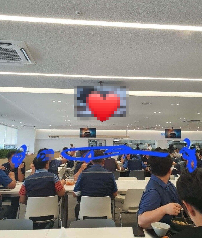 21일 온라인 커뮤니티 및 SNS에는 현대자동차 모 공장 구내식당에서 직원들이 식사를 하기 위해 가득 차 있는 모습이 공개됐다.