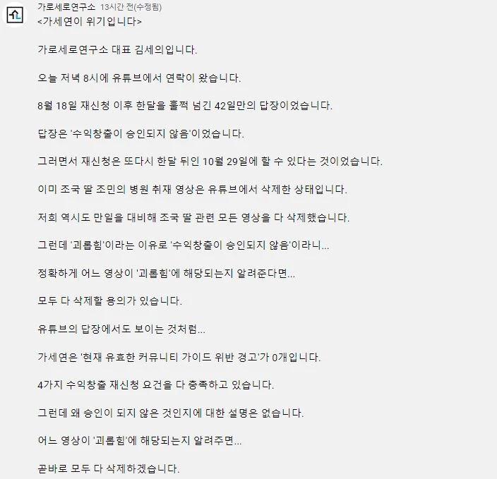 그가 쓴 글에 따르면 유튜브 채널 ‘가로세로연구소’는 유튜브로부터 수익 창출을 거절 당했다.