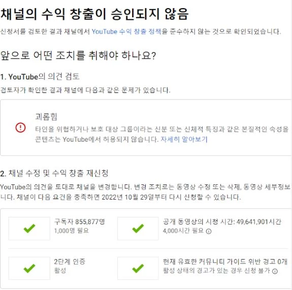 가세연 측은 지난 29일 “유튜브 측으로부터 ‘수익창출이 승인되지 않음’이라는 답장을 받았다. 위기다. 재신청은 한 달 뒤인 10월 29일에 할 수 있다”며 “이미 조국 딸 관련 영상은 다 지웠다. 그런데 괴롭힘 이유로 승인을 거절당했다”고 설명했다.
