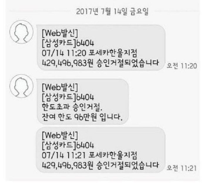 신용카드 뿐 아니라 삼성페이도 시도했지만 여전히 ‘한도초과’로 결제가 불가능하다는 말만 들었다고 설명했다.