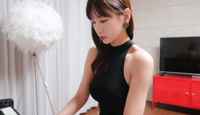 해당 영상 속에서 이해인은 옆트임이 난 블랙 원피스를 입고 피아노 앞에 앉았다.