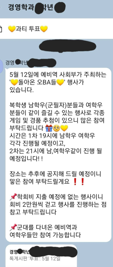 해당 소식을 접한 네티즌들은 행사 참여자 제한을 지적하며 “군필 선배로서 조언해주는 취지의 자리라면 남학우를 부르는 게 맞지 않냐. 의도가 너무 보인다”라고 댓글을 남겼다.