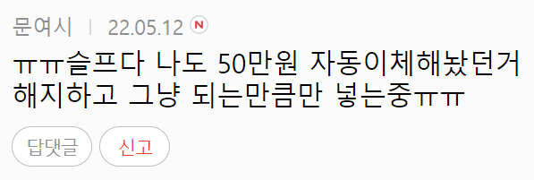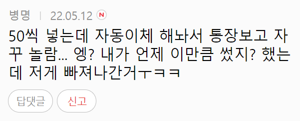 해당 게시물을 접한 네티즌들은 “나도 50만 원 자동이체 해놨던 거 해지하고 그냥 되는만큼만 넣는 중 ㅠㅠ”, “자동이체 되고 통장잔고 볼 때마다 놀란다”, “넣을 돈이 없는 것도 없는 거지만 이미 넣어둔 돈이 필요했던 걸수도…” 등의 반응을 보였다.