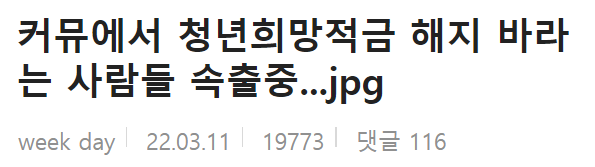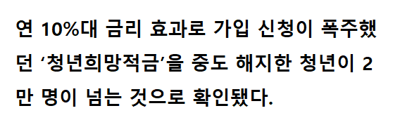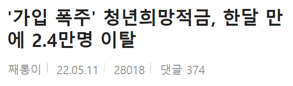 최근 한 국내 온라인 커뮤니티에 ”가입 폭주’ 청년희망적금, 한달 만에 2.4만명 이탈’이라는 제목의 게시글이 올라와 네티즌들의 이목을 끌었다.