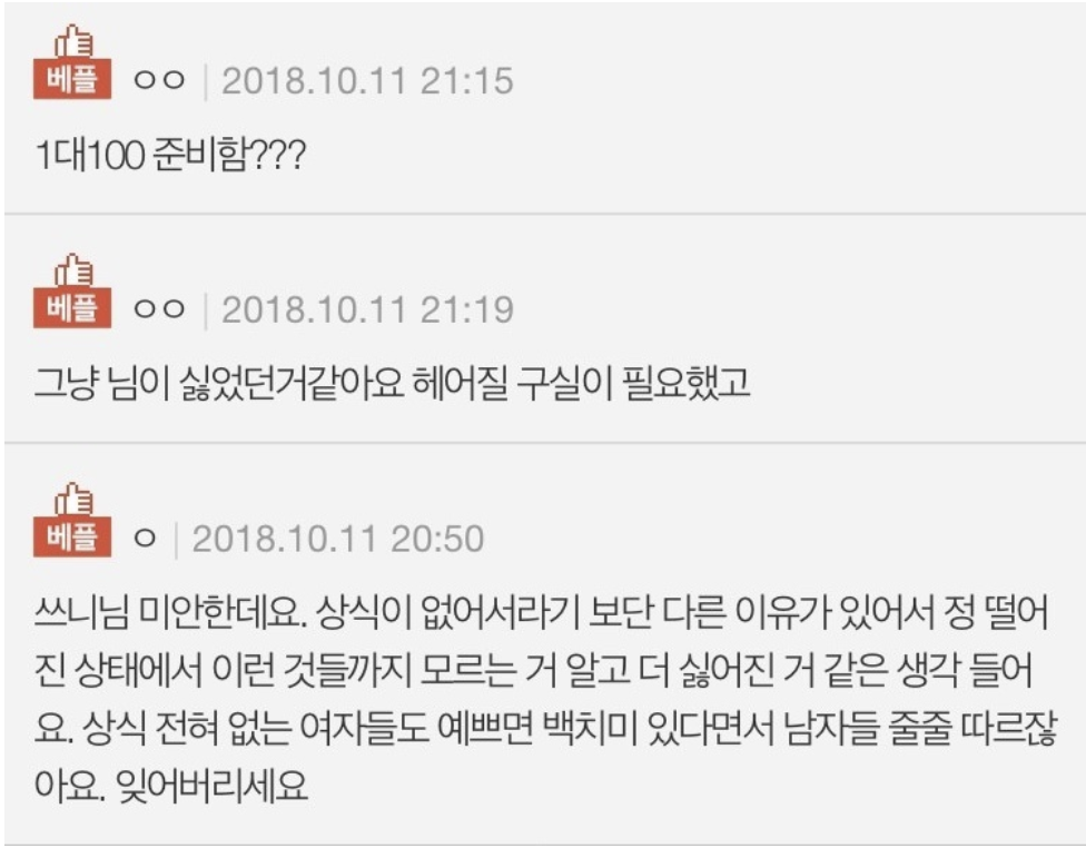 그러나 한 커뮤니티에 올라온 글은 한 남성이 헤어짐의 이유가 되냐며 누리꾼들에게 고민을 털어놓았고 많은 누리꾼들은 가지각색의 답변을 주었다.