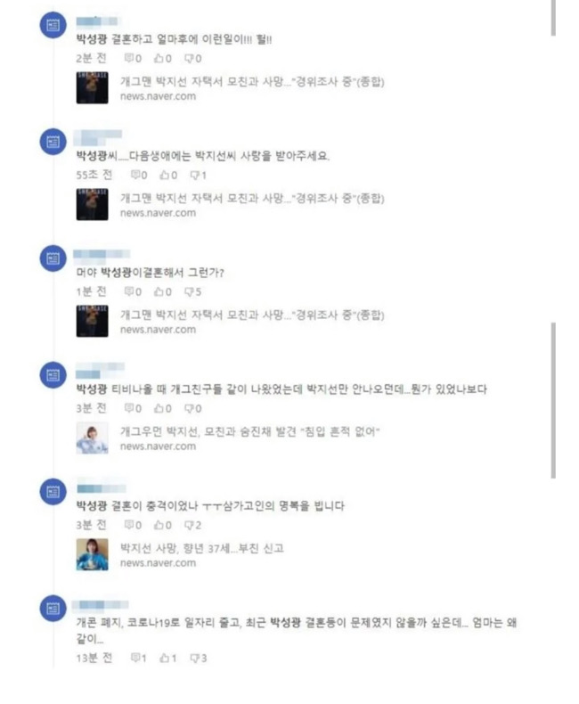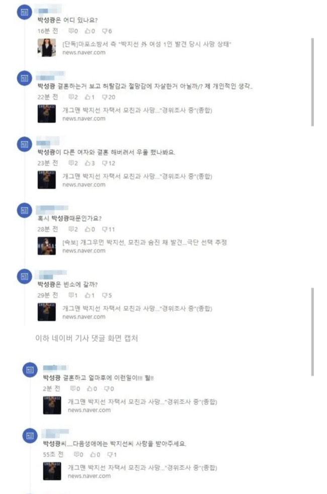 일부 악플러들은 “박성광 결혼이 충격이었나보다”, “박성광이 다른 여자와 결혼 해버려서 우울했나보다”, “박성광은 어디있나?” 등 도가 넘은 악플들을 달며 고인과 동료 개그맨들에 대한 모독을 이어가고 있어 눈살을 찌푸리게 하고 있다.