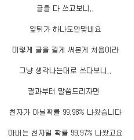 친자확인 의뢰해서 받은 결과 ADVERTISEMENT point 30 | point 80 | point 130 | ADVERTISEMENT point 0 | point 50 | point 100 | point 150 | ADVERTISEMENT point 0 | point 50 | point 100 | point 150 | ADVERTISEMENT point 0 | point 50 | point 100 | point 150 | ADVERTISEMENT point 0 | point 50 | point 100 | point 150 | ADVERTISEMENT point 0 | point 50 | point 100 | point 150 | ADVERTISEMENT point 0 | point 50 | point 100 | point 150 | ADVERTISEMENT point 0 | point 50 | point 100 | point 150 | 1 ADVERTISEMENT 온라인 커뮤니티 남자분 아직 현실감이 없어서 믿기지 않을 듯 ㅠ… ADVERTISEMENT