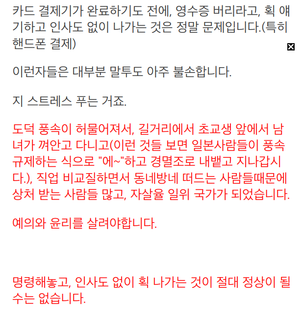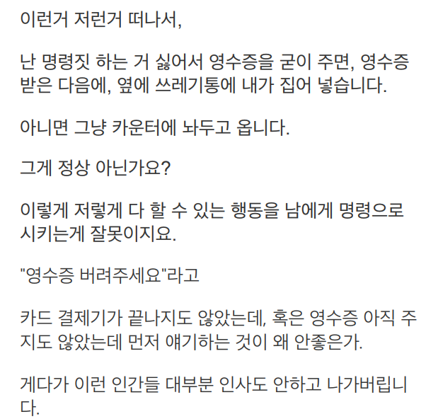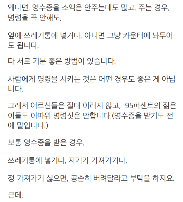 “20대들 고의적으로 스트레스 풀려고 ‘영수증’ 버리라고 명령하는 사람들 예의 좀 배우세요”