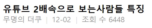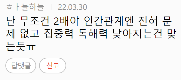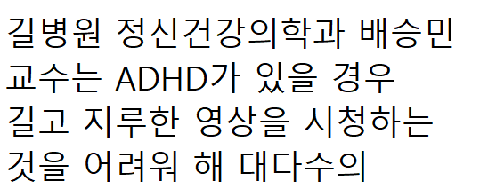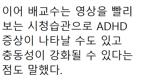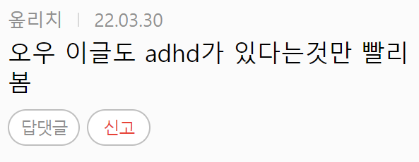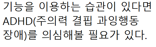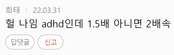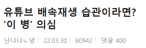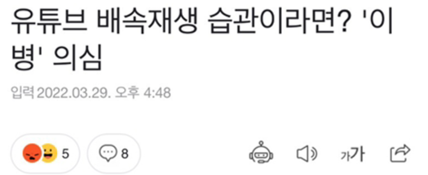 유튜브 ‘배속 재생’이 습관이신 분들, ‘이 질병’ 의심해보세요 (+진단 체크리스트) 최근 한 국내 온라인 커뮤니티에 ‘유튜브 배속재생 습관이라면? ‘이 질병’ 의심’이라는 제목의 게시글이 올라와 네티즌들 사이에서 화제다. ADVERTISEMENT point 50 | 온라인 커뮤니티 point 107 | ADVERTISEMENT point 0 | point 50 | point 100 | point 150 | 1 ADVERTISEMENT 온라인 커뮤니티 ADVERTISEMENT point 0 | 온라인 커뮤니티 point 57 | 온라인 커뮤니티 point 114 | ADVERTISEMENT point 0 | 온라인 커뮤니티 point 57 | 온라인 커뮤니티 point 114 | ADVERTISEMENT point 0 | point 50 | 1 온라인 커뮤니티 ADVERTISEMENT 온라인 커뮤니티 해당 게시물을 접한 네티즌들은 “나 ADHD인데 1.5배 아니면 2배속이다”, “난 무조건 2배인데.. 집중력 독해력 낮아지는 건 맞는듯 ㅠ”, “이 글도 ADHD 있다는 부분만 빨리 봄” 등의 반응을 보였다. ADVERTISEMENT 온라인 커뮤니티 온라인 커뮤니티 온라인 커뮤니티 ADVERTISEMENT point 0 | point 50 | point 100 | point 150 | ADVERTISEMENT point 0 | point 50 | point 100 | 1 온라인 커뮤니티 ADVERTISEMENT 온라인 커뮤니티 ADVERTISEMENT point 0 | 온라인 커뮤니티 point 57 | point 107 | ADVERTISEMENT point 0 | point 50 | point 100 | 1 온라인 커뮤니티 온라인 커뮤니티 ADVERTISEMENT [저작권자 NEWSNACK/ 무단복사, 무단전재 및 재배포 금지 (위반 시 법적조치)]