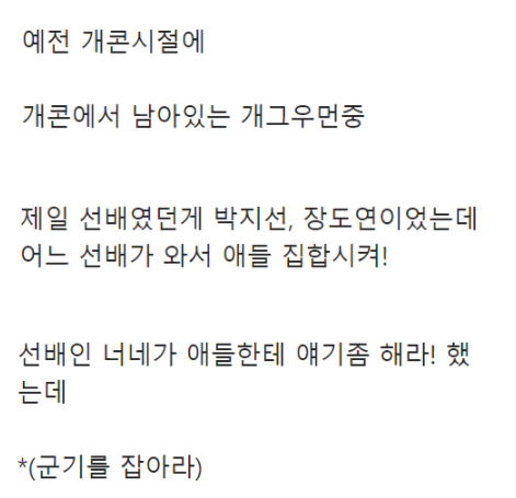 개콘의 종말이 다가오기전 장도연과 박지선이 최고참 선배가 되었을때 그 위의 선배가 갑자기 와서 애들 집합을 시키라고 했다.