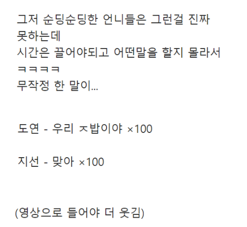 이렇게 착하고 재밌는 선배들 때문에 둘의 모습을 보고 웃음 참느라 고된 시간을 보냈다고 한다.