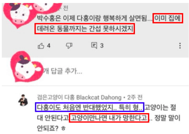 박수홍의 유튜브 채널에 “집에 데려온 동물까지는 간섭 못 하시겠지”라는 댓글이 달리자, 박수홍이 “다홍이도 처음엔 반대했었지. 특히 형… 고양이는 절대 안 된다고 고양이 만나면 내가 망한다고…. 정말 말도 안 되죠?”라 답글을 남기기도 했다.