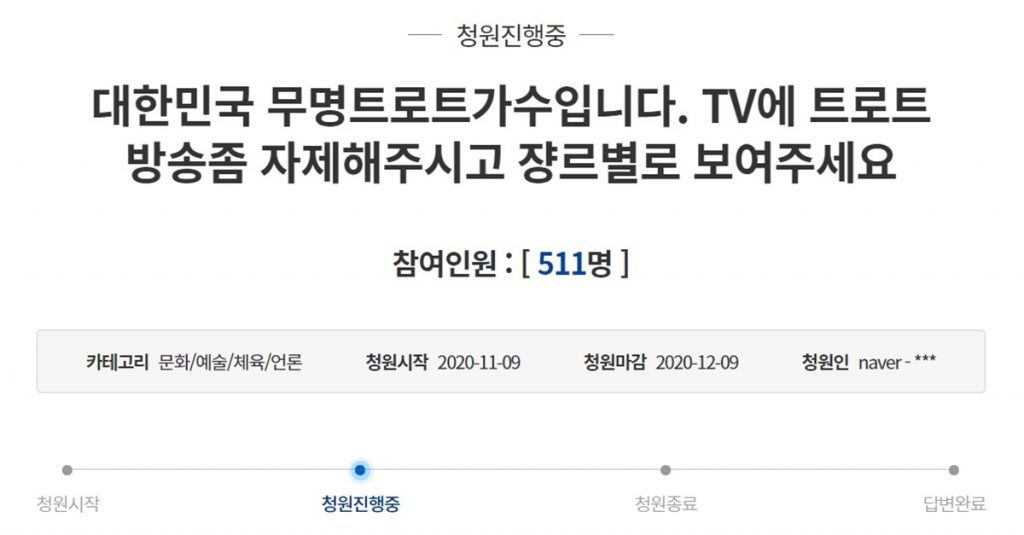 자신을 트로트 가수라고 밝힌 청원인은 “대한민국 방송이 트로트 방송밖에 없는 듯하다. 시청률로 혈안이 되어 방송국마다 경쟁이 붙은 듯 이제는 좀 자제해야 되지 않을까”라고 말했다.