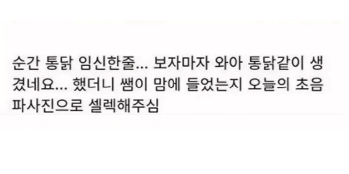 A씨는 “순간 통닭을 임신한 줄 알았다. 보자마자 ‘와아 통닭같이 생겼네요’라고 했다”고 전했다.