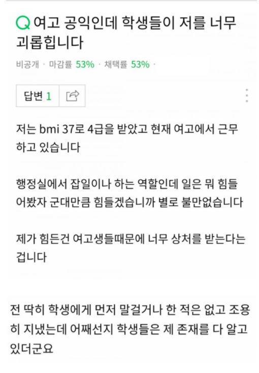글을 작성한 A씨는 “저는 여고 공익인데요.. 학생들이 저를 너무 괴롭힙니다ㅠㅠ“라는 제목의 글로 많은 이들의 이목을 집중시켰다.