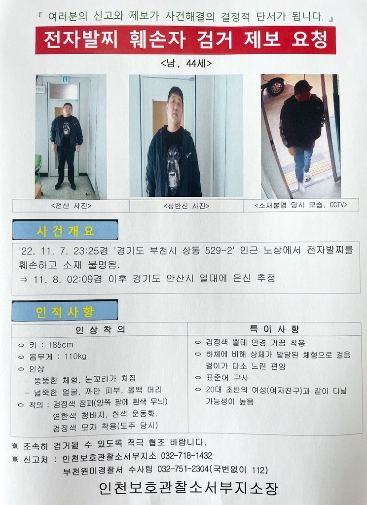 법무부 인천보호관찰소 서부지소도 A씨를 공개수배하고 제보(☎ 032-718-1432)를 받고 있는데, 인천 거주자인 A씨는 키 185㎝·몸무게 110㎏으로 뚱뚱한 체형이며 검정 점퍼와 모자, 청바지를 착용하고 있다.