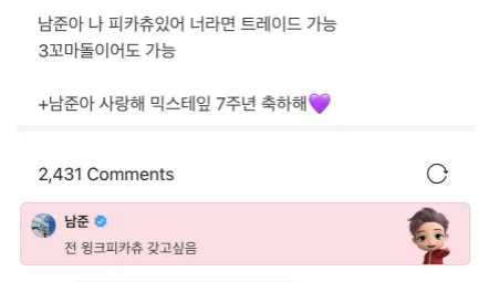 이에 ‘아미'(방탄소년단 팬클럽)는 위버스에 RM에게 “씰을 교환해주겠다”라는 내용의 글을 남겼고, RM은 팬들의 글에 “윙크 피카츄 갖고 싶다”라는 답변을 남기기도 했다.