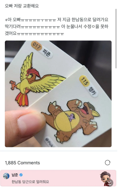 ‘피죤’과 ‘캥카’ 씰을 올린 팬에게는 “한남동 당근(마켓)으로 올려줘요”라고 댓글을 달았다.