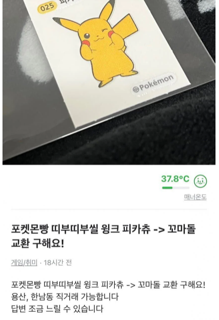 사진에는 ‘포켓몬빵’ 띠부띠부씰에 푹 빠진 그동안의 근황이 담겨있었다.