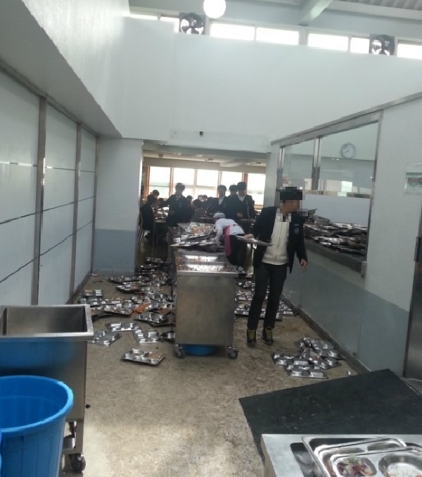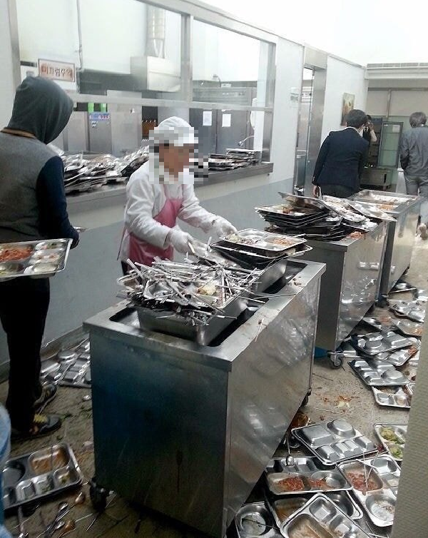 식판이 엎어져 난장판이 된 급식실 사진이 논란을 모으고 있다.