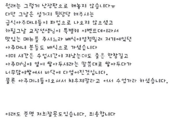 이어 “이미 수업시간이 지났는데도 줄이 길었다. 조리사분들의 말씀대로 옆에 쌓아두다가 너무 많이 쌓여서 바닥에 엎어진 것”이라며 “조리사분들도 오셔서 치우지 말고 어서 수업 가라고 하셨다”고 전했다.