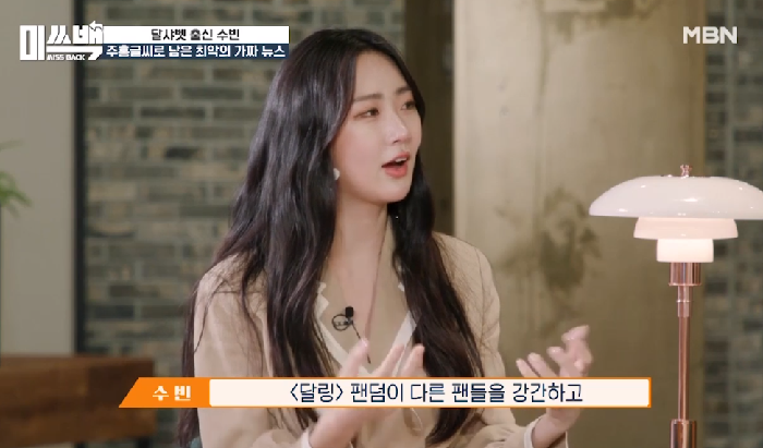 또한 팬들과 만난 자리에서 수빈은 달샤벳 활동 당시 팬클럽 ‘달링’이 시달렸던 악성 가짜 뉴스에 대해 언급했다. 수빈은 “발단은 연말 시상식 무대를 남자 아이돌과 커플 댄스를 춘 것”이라며 “당시 섹시 댄스를 춘 언니가 가짜 뉴스에 시달렸고, 결정적으로 아이돌 육상 대회에서 큰일이 벌어졌다”고 말했다.
