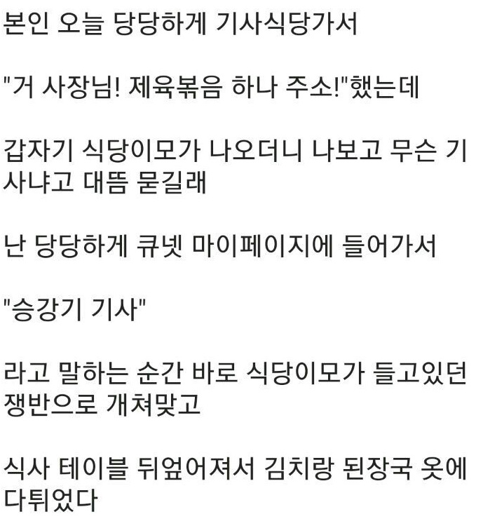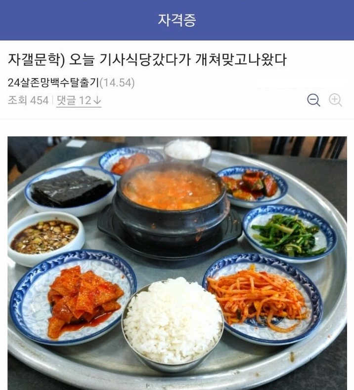 게시글을 올린 작성자 A씨는 “오늘 기사식당갔다가 개쳐맞고 나왔다”라는 제목의 글로 많은 이들의 관심을 끌었다.