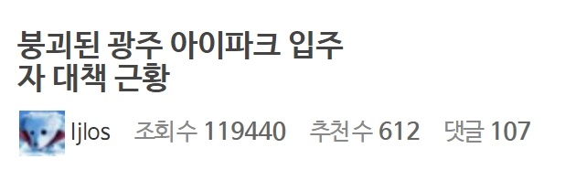 작성자 A씨는 “붕괴된 광주 아이파크 입주자 대책근황” 라는 제목의 글로 많은 이들의 궁금증을 유발 시켰다.
