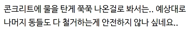 건물이 이 정도로 심하게 손상된 상황에서 사고가 재발되는 사태를 막기 위해서는 원인이 무엇이든 간에 최소한 201동은 전체 철거 후 재건축해야 할 것이며,만약 자재나 시공방식 등 문제로 판명되어 전반적으로 상황이 심각하다면 1단지를 포함해 모든 동을 다 철거하고 자재 선택부터 다시 시작해야 할 수도 있다.