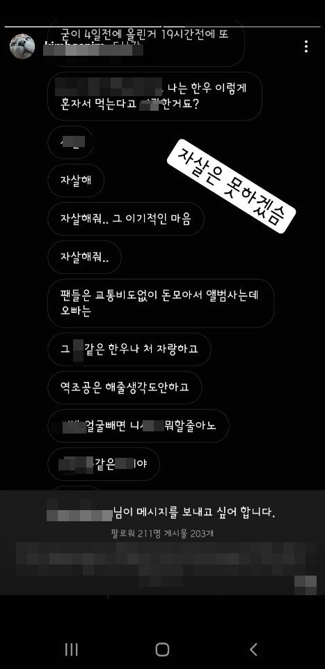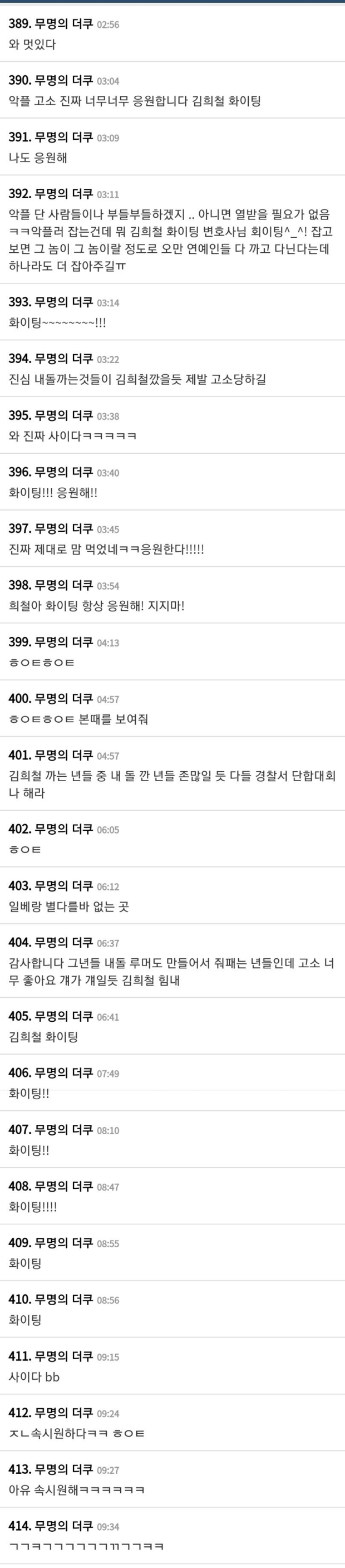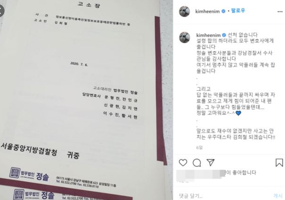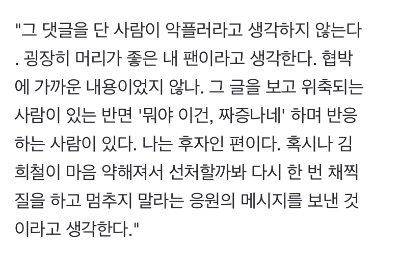 그리고 한 악플러는 자신을 고소하면 자.살할 것이라며 엄포를 놓는 글을 쓰기도 했는데 해당 글을 김희철이 읽었고 그에대한 피드백을 남겼다.