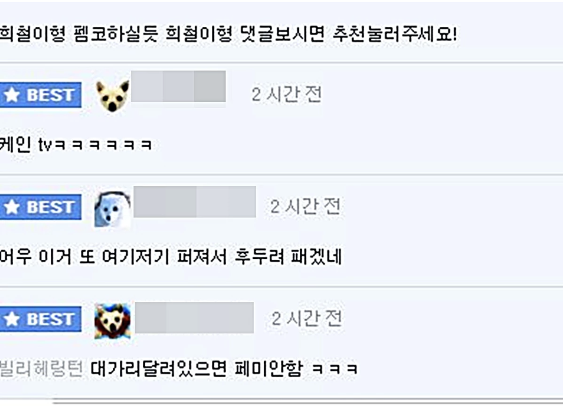 해당 김희철의 반응을 보고 주로 악플을 달았던 여초 커뮤니티 사이트에서는 “하던 말던 신경안씀 ㅋㅋ” “어쩌라고~” 등의 반응을 보였지만 뒤에서는 엄청난 스트레스와 불안감에 빠져 일상생활 하기 힘들 것이다.