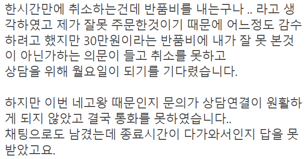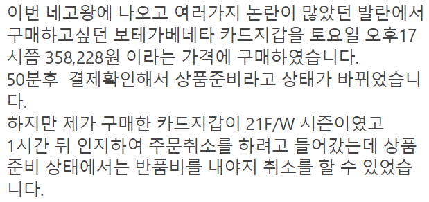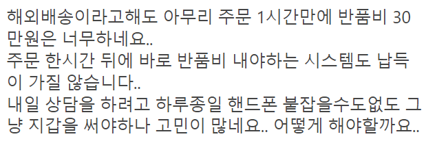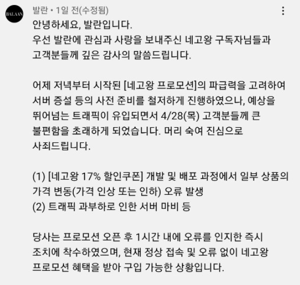“반품비 30만 원, 고객센터 연락 두절”..이번 네고왕 ‘발란’의 만행 모음 최근 국내 온라인 커뮤니티에서 네고왕 X 명품 구매 대행 플랫폼 ‘발란’에 대한 비판이 식지 않고 있다. ADVERTISEMENT point 50 | 온라인 커뮤니티 point 107 | ADVERTISEMENT point 0 | 온라인 커뮤니티 point 57 | point 107 | ADVERTISEMENT point 0 | point 50 | 1 온라인 커뮤니티 온라인 커뮤니티 ADVERTISEMENT 온라인 커뮤니티 ADVERTISEMENT 온라인 커뮤니티 ADVERTISEMENT 온라인 커뮤니티 ADVERTISEMENT point 0 | 온라인 커뮤니티 point 57 | 온라인 커뮤니티 point 114 | ADVERTISEMENT point 0 | 온라인 커뮤니티 point 57 | 온라인 커뮤니티 point 114 | ADVERTISEMENT point 0 | 온라인 커뮤니티 point 57 | 온라인 커뮤니티 point 120 | 1 ADVERTISEMENT ADVERTISEMENT 온라인 커뮤니티 ADVERTISEMENT 온라인 커뮤니티 ADVERTISEMENT point 0 | 온라인 커뮤니티 point 57 | 온라인 커뮤니티 point 114 | ADVERTISEMENT point 0 | 온라인 커뮤니티 point 57 | 온라인 커뮤니티 point 114 | ADVERTISEMENT point 0 | 온라인 커뮤니티 point 57 | 온라인 커뮤니티 point 114 | ADVERTISEMENT point 0 | 온라인 커뮤니티 point 57 | 온라인 커뮤니티 point 114 | ADVERTISEMENT point 0 | 온라인 커뮤니티 point 57 | 온라인 커뮤니티 point 120 | 1 ADVERTISEMENT 이에 발란 측은 “17% 할인 쿠폰을 적용하는 과정에서 서버 오류로 일부 상품 가격의 변동이 있었고, 현재 다시 수정을 하고 있다”며 “인상된 가격으로 구매한 고객에게는 환불 등 보상책 마련을 검토하고 있다”고 해명했다. ADVERTISEMENT point 50 | 온라인 커뮤니티 point 107 | ADVERTISEMENT point 0 | 온라인 커뮤니티 point 57 | point 107 | ADVERTISEMENT point 0 | point 50 | 1 온라인 커뮤니티 온라인 커뮤니티 ADVERTISEMENT [저작권자 NEWSNACK/ 무단복사, 무단전재 및 재배포 금지 (위반 시 법적조치)]