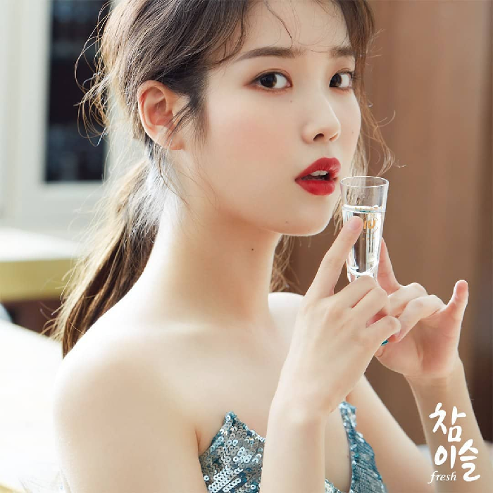 해당 사진 속 아이유는 긴 생머리를 푼 채 입에 소주잔을 갖다 대고 있다. 소주잔에는 ‘IU’라는 글자가 적혀있다.