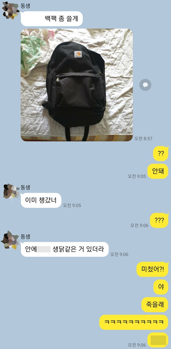 공개된 카카오톡 대화내역을 보면 여동생이 오빠인 A씨의 백팩을 빌리는 것을 확인할 수 있다.