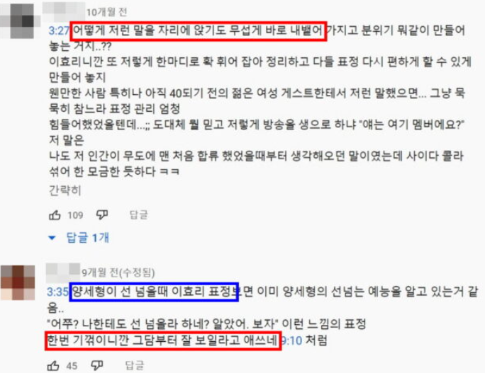 이 글을 본 네티즌들은 ”방송에서 어떻게 저런 말을 하지?”, ”양세형 또 선 넘는다”, ”양세형 이효리한테 한번 기 꺾이니까 그 다음부턴 잘 보이려고 애쓰네”라 다양한 댓글을 보였다.