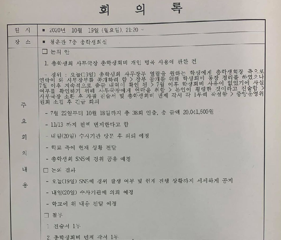 이어 “총학생회는 학우분들이 납부한 학생회비를 사무국장이 모든 관리권한을 전임하도록 했다. 2020년도 1학기 이후 학생회비 지출 내역이 없기에, 통장 정리를 해야 할 경각심을 가지고 있지 않았다. 진심으로 사과의 말씀 전한다”고 밝혔다.