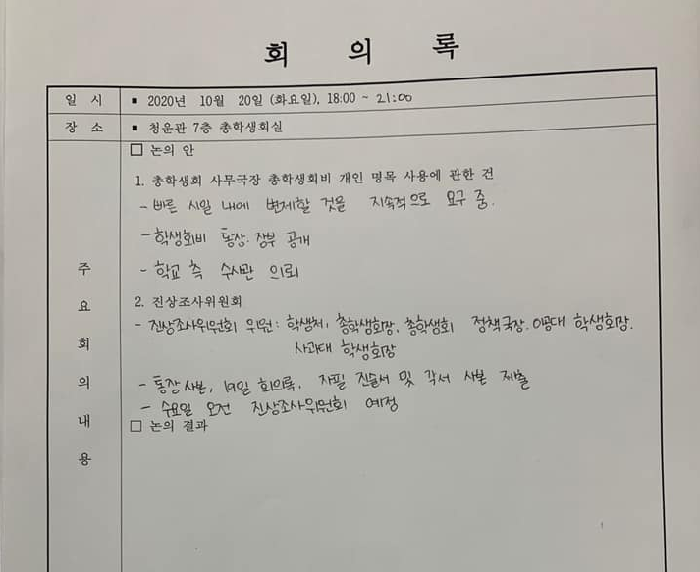 다음날인 지난 20일 총학생회 측은 다시 글을 올려 “현재 학교 측과 진상조사위원회를 구성해 모든 관련 자료들을 제출했고 진상을 면밀히 파악 중에 있다”고 말했다.