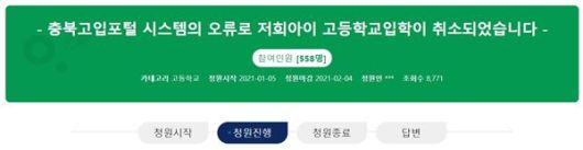해당 학부모는 충북교육청 청원광장에 ‘충북고입포털 시스템의 오류로 저희 아이 고등학교 입학이 취소되었습니다’라는 글을 올려 “충북고입포털 시스템의 오류로 빚어진 일”이라며 대책을 호소하고 있다.