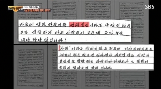 이어 “실제 범행에도 묻어 있다. 증거 하나 남기지 않으려는 특성을 보였다. 이전에는 유영철과 같은 범죄자가 드물어서 심리학자나 전문가들이 면담을 많이 했다. 사이코패스라는 용어도 처음 나왔다. 유영철은 살인마에게도 등급이 있다고 생각했다. 그래서 편지에 우월감이 들어 있는 것”이라고 덧붙였다.